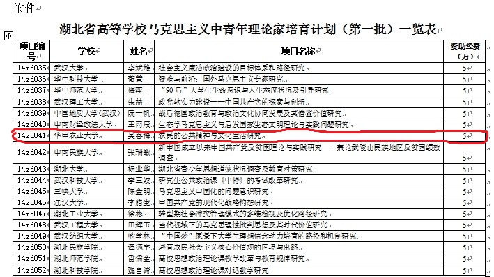 近日,湖北省教育厅发文(鄂教思政函[2014]2号)公布了“全省高等学校马克思主义中青年理论家培育计划(第一批)”入选名单,全省共有18人入选。我院吴春梅教授入选该计划,其获批立项资助的项目为“农民的公共精神与文化生活研究”。