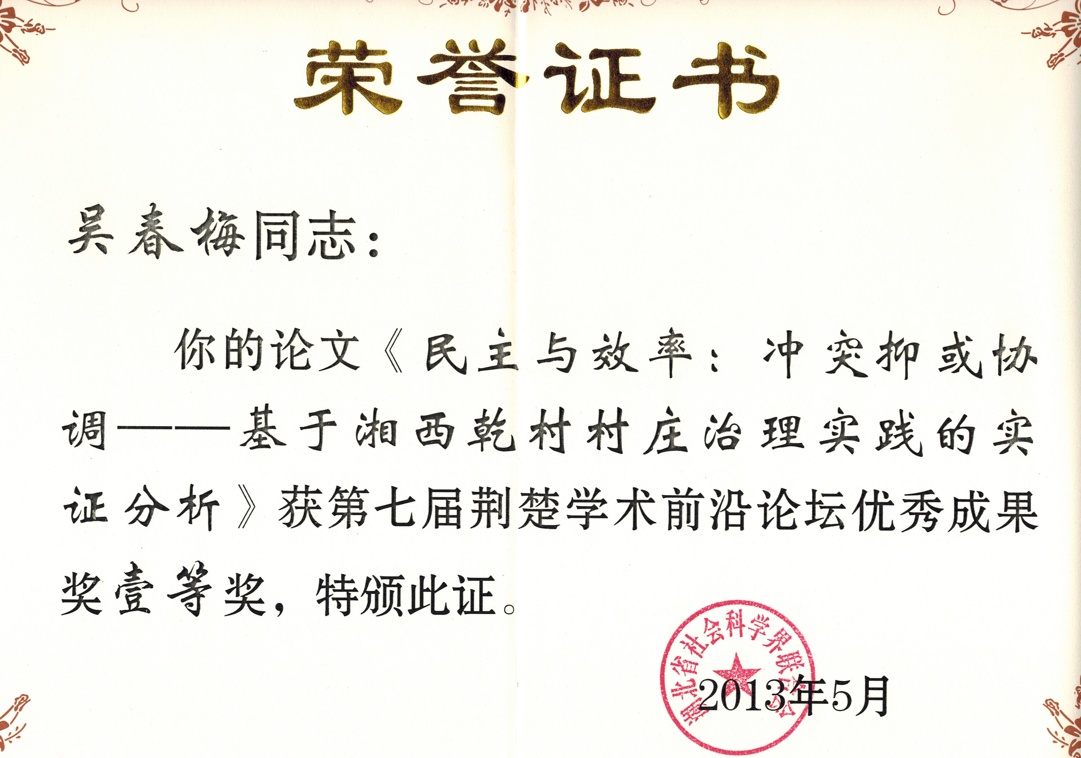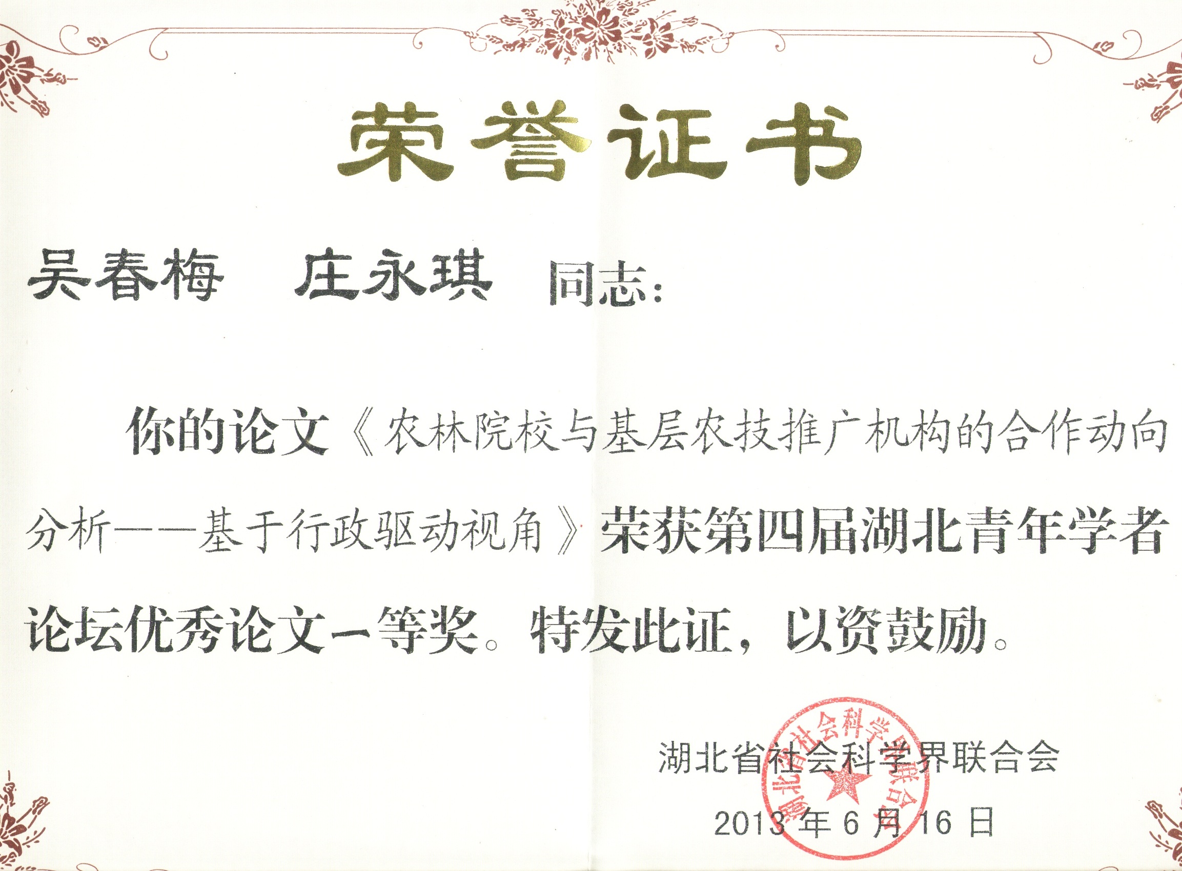 近日,从湖北省社会科学界联合会获悉,我院吴春梅教授的论文《民主与效率:冲突抑或协调——基于湘西乾村村庄治理实践的实证分析》获得第七届荆楚学术前沿论坛优秀成果一等奖,吴春梅教授和庄永琪的论文《农林院校与基层农技推广机构的合作动向分析——基于行政驱动视角》获第四届湖北青年学者论坛优秀论文一等奖,受到湖北省社科联的表彰。