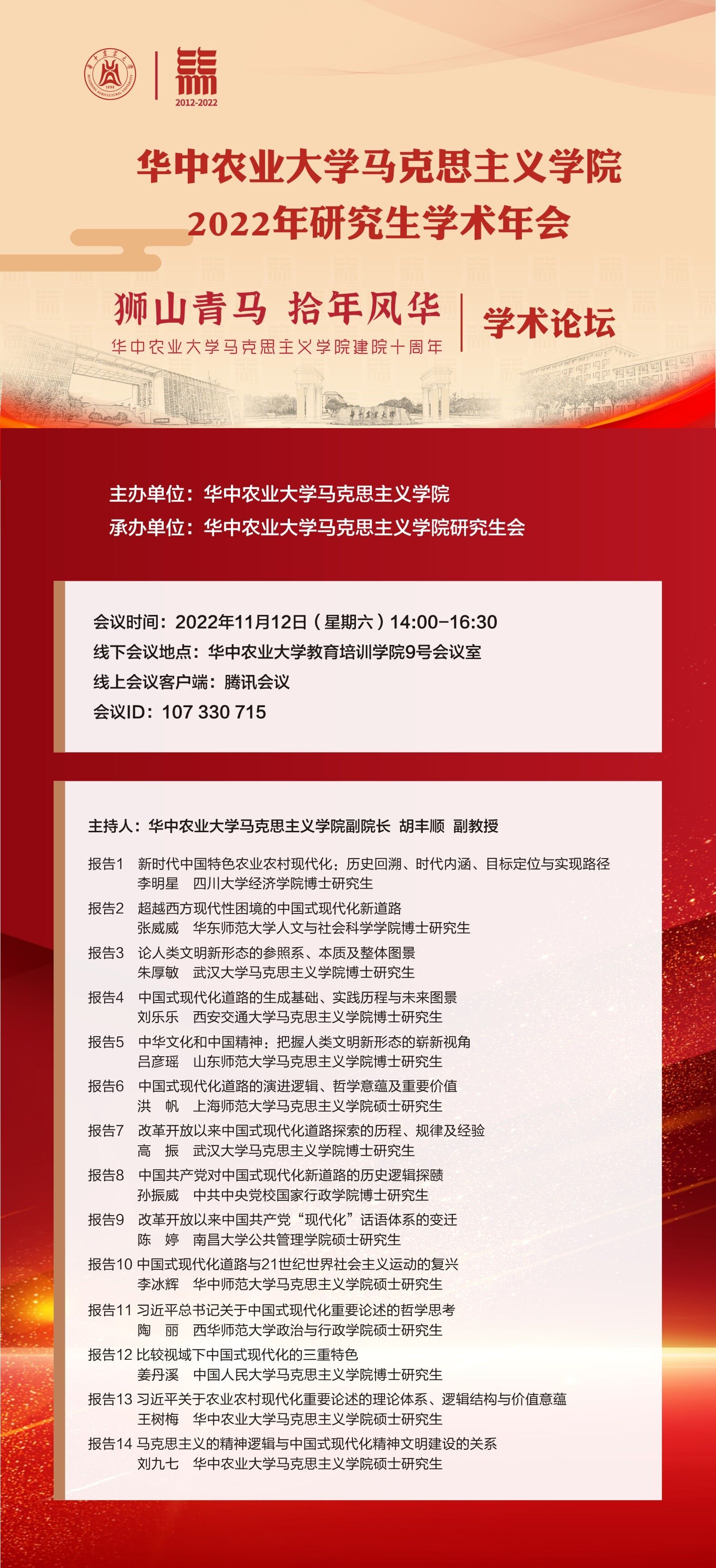 11月12日,365英国上市公司2022年研究生学术年会在教育培训学院9号会议室顺利召开。本次学术年会以“中国式现代化新道路”为主题,共收到117所高校(党校)199篇学术论文,其中25篇论文获评优秀论文;14位来自四川大学、华东师范大学、武汉大学、西安交通大学、山东师范大学、上海师范大学、中共中央党校(国家行政学院)、南昌大学、365英国上市集团等高校的博士、硕士研究生在线进行了学术交流汇报。会议由365英国上市公司副院长胡丰顺主持。