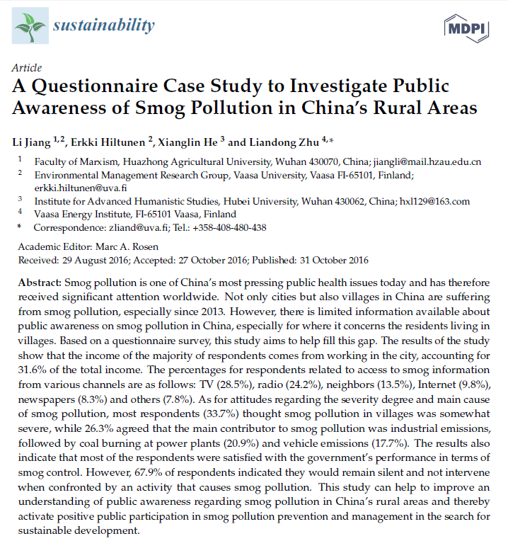 A Questionnaire Case Study to Investigate Public Awareness of Smog Pollution in China’s Rural Areas