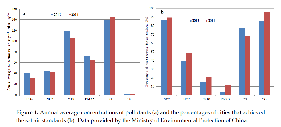 On 4 June 2015, the Ministry of Environmental Protection of China officially issued the 2014 Chinese Environmental State Report. The report showed that only eight of the 74 monitored cities met urban air quality standards in 2014 in terms of annual average value, accounting for 10.8%. In other words, 89.2% of the monitored cities experienced air pollution at a range of different levels. Figure 1 shows the annual average concentrations of SO2, NO2, PM10, PM2.5, O3and CO, as well as the percentages of cities that achieved the set air standards. Since PM10 (fine particles with a diameter of 10 μm or less) and PM2.5 (fine particles with a diameter of 2.5 μm or less) are the main pollutants that form smog, the low percentages of cities that reached the set standards indicate that smog pollution has clearly affected a wide range of areas and the impact of this is extremely serious. Along with the development of rural areas, villages in China are also experiencing worse smog pollution issues [5]. In addition, smog is not stationary and can flow into the countryside from cities. Thus, most rural areas cannot be exempted from smog pollution.