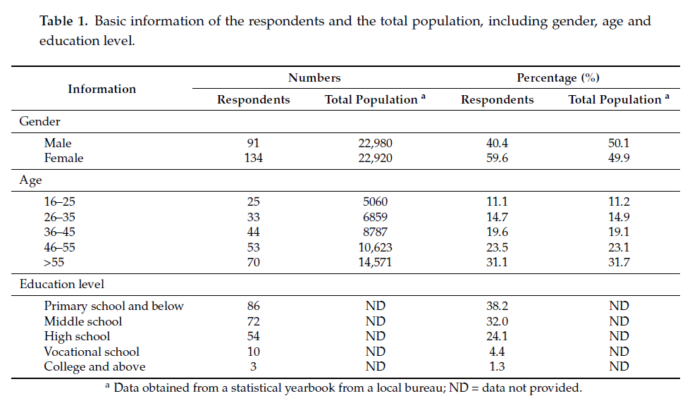 The demographic composition of the respondents and the total population in the area is illustrated in Table 1. More respondents in the Xinjie rural areas were female (59.6%), higher than the female composition in the total population (49.9%). This may have been because, compared to women, more men choose to pursue work or do business in cities. Respondents aged over 55 accounted for 31.1%, which was the highest proportion. This is in accordance with the phenomenon that persons aged between 20 and 50 in most villages in China generally choose to work in cities to earn a better income [13]. The respondents who had primary school education or who lacked any education made up the dominant portion of respondents, accounting for 38.2% of the total, while only 5.7% of respondents had vocational education, college or above-college experiences. For this reason, we needed to explain the scenarios to the group of people with a lower education level while conducting the survey. By comparison of age distribution between respondents and the total population, the samples randomly selected in this survey were representative.