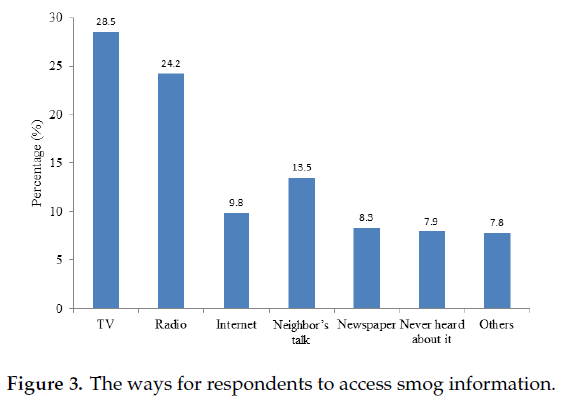 A substantial proportion of residents (8%) from the Xinjie rural areas had never heard of smog (Figure 3); most of them were older than 55 years and had a low education level. This is in line with research carried out by Dijkstra and Goedhart [16], who suggested that education level correlated with people’s knowledge about certain topics. Most of the respondents accessed smog information from different channels. A majority of the respondents (28.5%) accessed smog information from TV, followed by the radio (24.2%) and neighbors (13.5%). The percentages for TV and radio as smog information access channels were significantly (p < 0.05) higher than for other channels. in rural areas, almost every family has a tv and/or radio; it is therefore convenient for them gain smog information this way, for example from weather forecasts or news programs. a small proportion of the respondents (9.8%) could access the internet using a computer or smart phone, where they were able to read news or reports online. it is not surprising to see that 90% of respondents from this proportion are aged less than 45. the findings also show that 8.3% and 7.8% of local people suggested that smog information was available to them via newspapers or other channels, respectively.