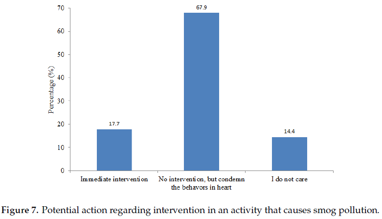 In terms of respondents’ potential action for intervening in an activity that causes smog pollution, different opinions were measured among the respondents. A predominant percentage of respondents (67.9%) chose to remain silent without any intervention, despite not liking behaviors that led to smog pollution (Figure 7). These respondents may instead passively wait for environmentally conscious individuals to act on their behalf [24]. Only 17.7% of the surveyed people wanted to be involved in interventions. A limited number of respondents (14.4%) did not care about smog-causing activities. This may have been because they were unaware of the relevant harmfulness of smog pollution, or because they thought intervention was not their business, which is a common psychological phenomenon [18]. There was a significant (p < 0.05) positive relationship between respondents’ intervention choices and their education levels. people with slightly higher education levels (e.g., high school, vocational school and college) were more prone to protecting the environment and becoming involved in fighting smog pollution. in addition, more male respondents chose to be involved in interventions, accounting for 68.1%. thus, public education targeting rural residents with lower education levels should be improved.