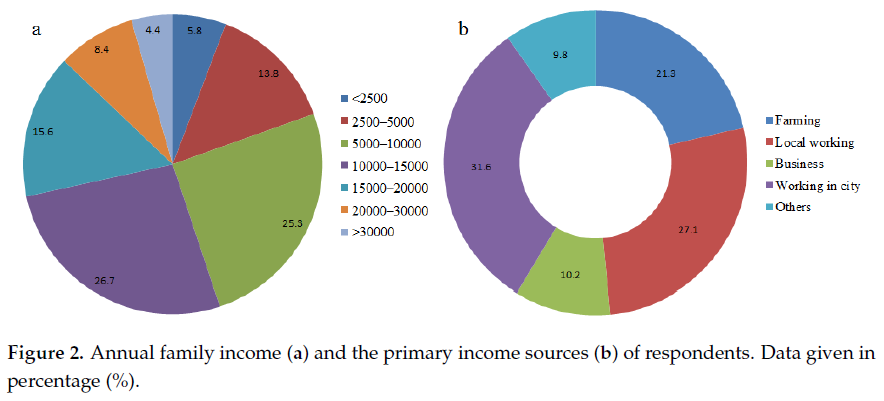 Figure 2. Annual family income (a) and the primary income sources (b) of respondents. Data given in percentage (%).