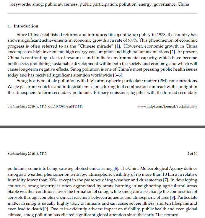 China experiences severe smog pollution problems [4]. The main composition of smog is sulphur dioxide (SO2), nitrogen oxide (NOx) and particulate matter. SO2 and NOx are gaseous pollutants. It is widely accepted that particulate matter is the primary contributor to smog aggravation, since it can be combined with fog to form smog [10]. In China, the main reasons for the formation of smog include industrial emissions, vehicle exhaust, waste gas from coal burning, and dust from construction sites and road traffic.