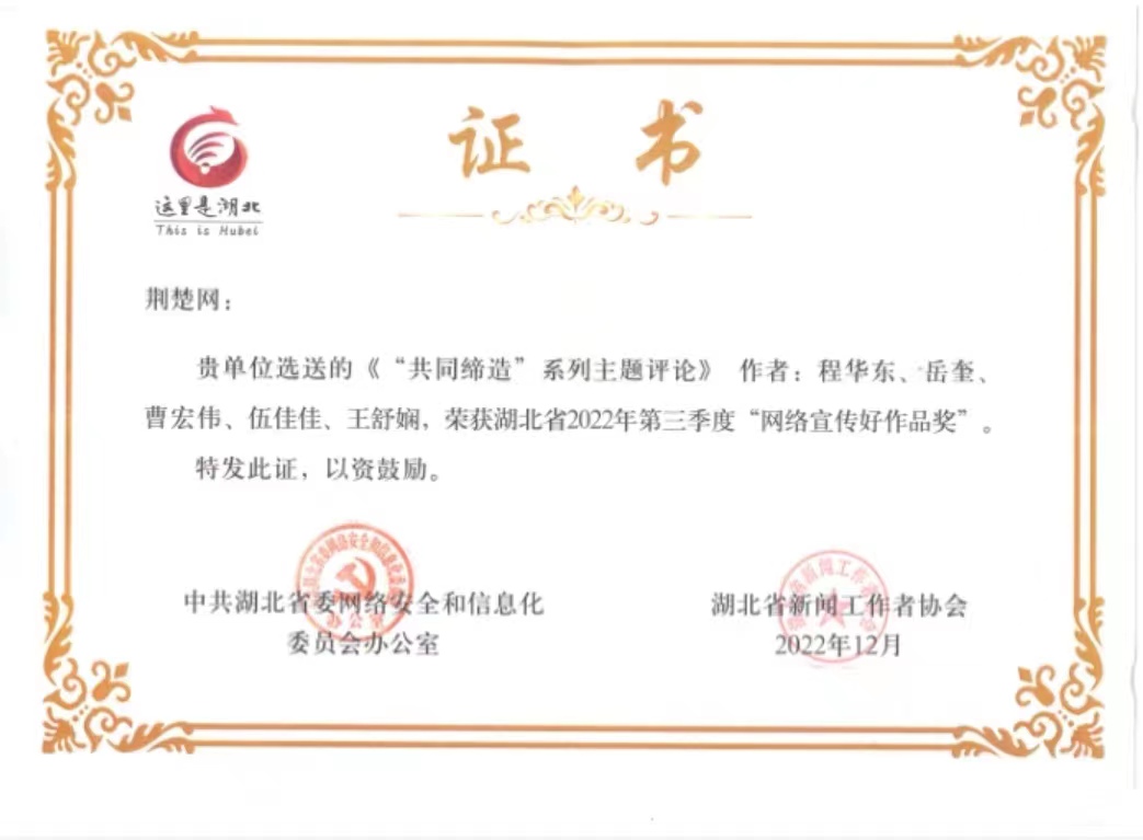 近日,由湖北省委网信办(湖北省互联网信息办公室)、湖北省记协联合举办的全省2022年第三季度“网络宣传好作品奖”评选结果正式揭晓。经专家评审、网上公示,我院程华东教授联合荆楚网等单位个人完成的作品《“共同缔造”系列主题评论》脱颖而出,获此殊荣。据悉,全省本次共有50件作品获得该奖项。