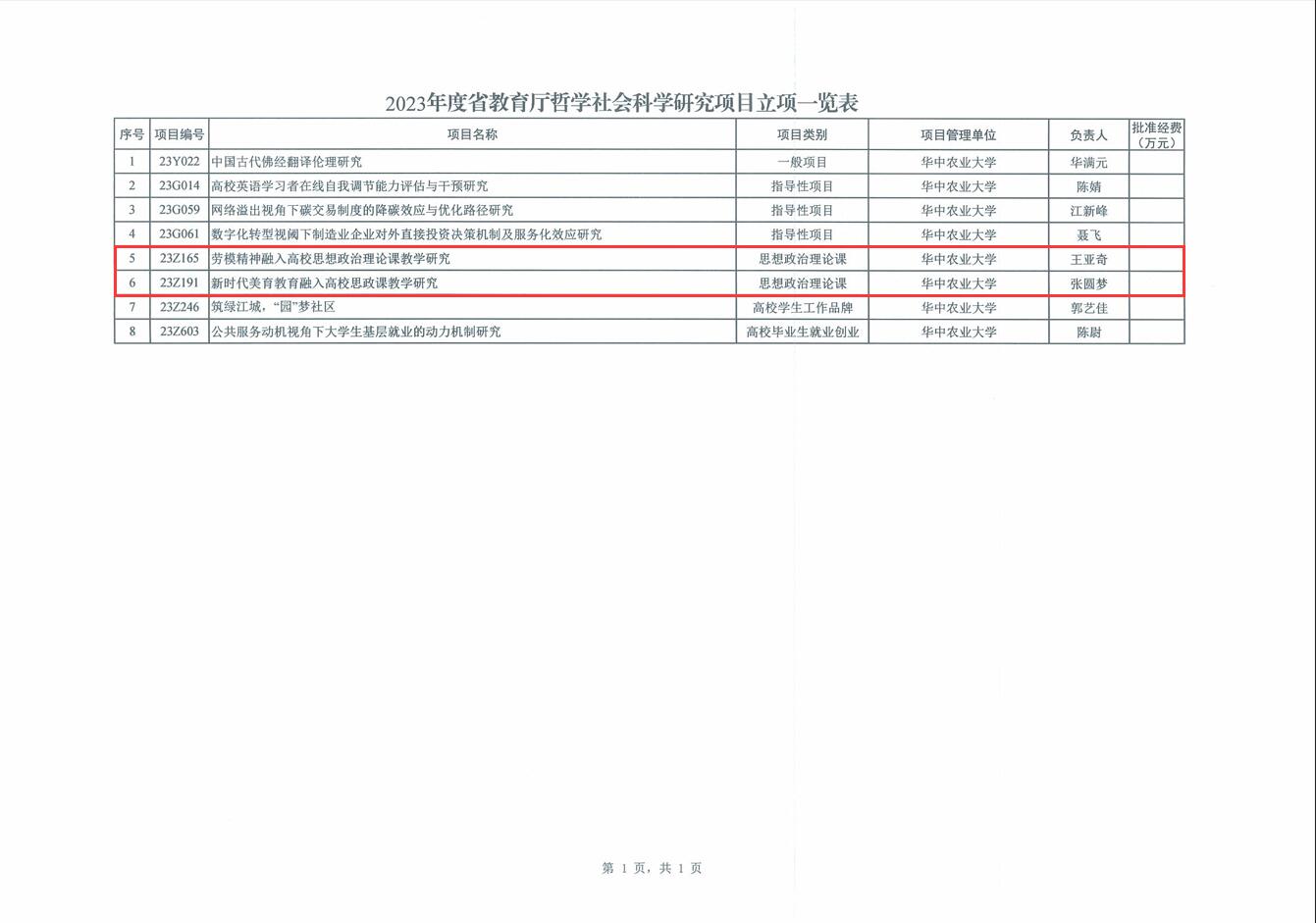 近日,从2023年度湖北省教育厅哲学社会科学研究项目和专项任务项目拟立项名单公示获悉,我院青年教师王亚奇博士主持的《劳模精神融入高校思想政治理论课教学研究》、张圆梦博士主持的《新时代美育教育融入高校思政课教学研究》获2023年度省教育厅哲学社会科学研究项目立项。