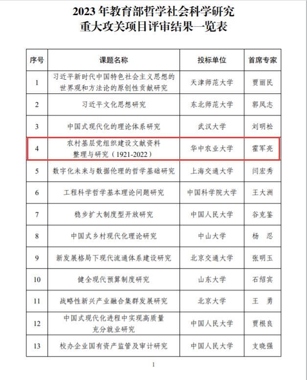 核心提示:近日,全国哲学社会科学工作办公室公布2023年度国家社科基金重大项目立项名单,我校公共管理学院柯新利教授申报的课题获批立项。教育部社科司批准下达2023年度教育部哲学社会科学重大课题攻关项目,我校365英国上市公司霍军亮教授申报的课题获批立项。