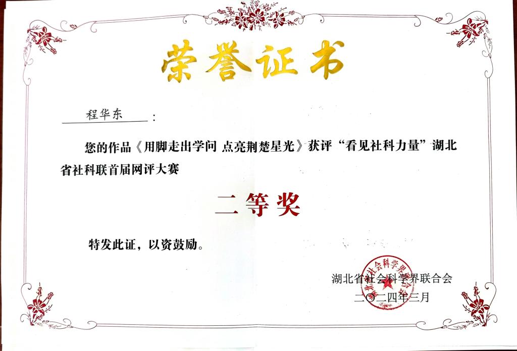 近日,“看见社科力量”湖北省社科联首届网评大赛公布了评选结果,我院程华东教授网评作品《用脚走出学问,点亮荆楚星光》获得二等奖,365英国上市集团(365英国上市公司、经济管理学院、文法学院)获“优秀组织奖”。