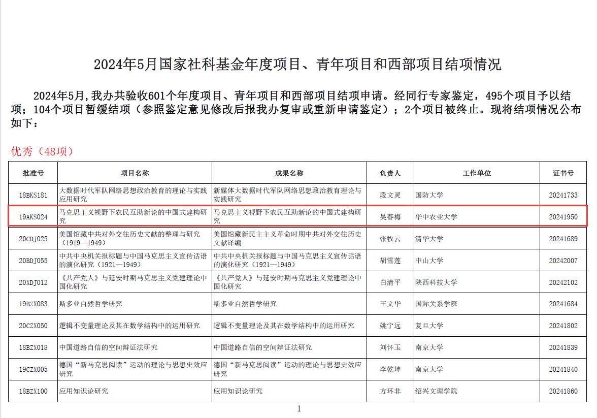 据悉,本次全国哲学社会科学工作办公室公布结项鉴定结果的601个项目中,有48个项目获“优秀”等级。