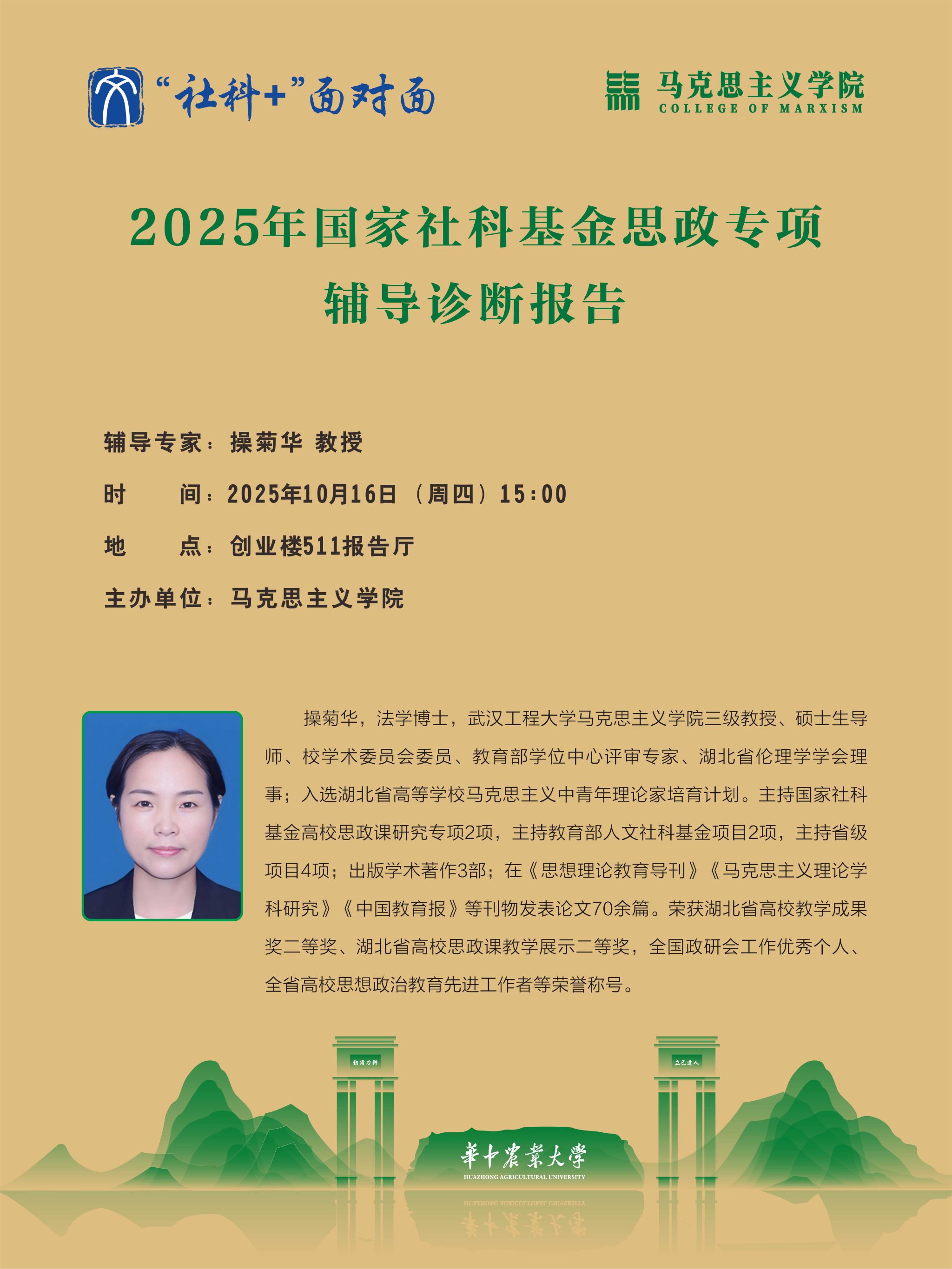 10月16日下午,2025年国家社科基金思政专项辅导诊断报告在创业楼511报告厅举行。武汉工程大学365英国上市公司教授、教育部学位中心评审专家操菊华教授应邀作“国社科思政专项申报体会”专题辅导报告,报告会由副院长胡丰顺主持。