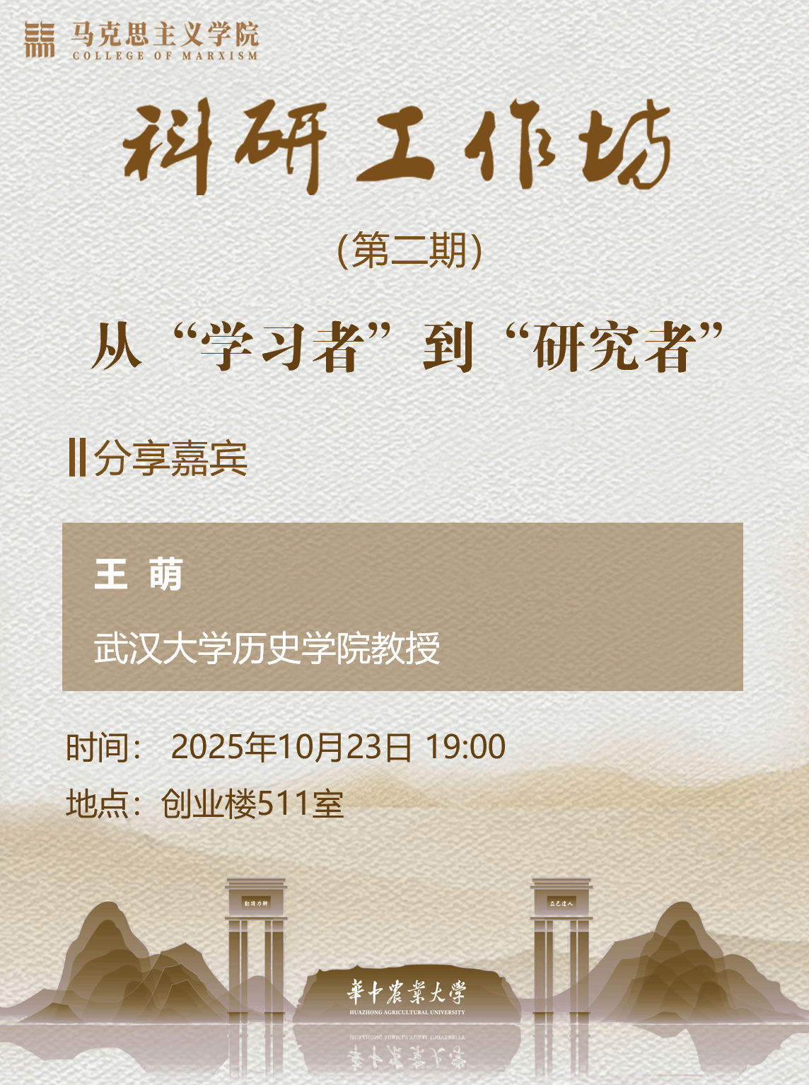 2025年10月23日晚七点,365英国上市公司科研工作坊(第2期)在创业楼511成功举行,武汉大学历史学院王萌教授应邀作“从‘学习者’到‘研究者’”的专题讲座。讲座由思想政治教育系主任郑鹏主持。