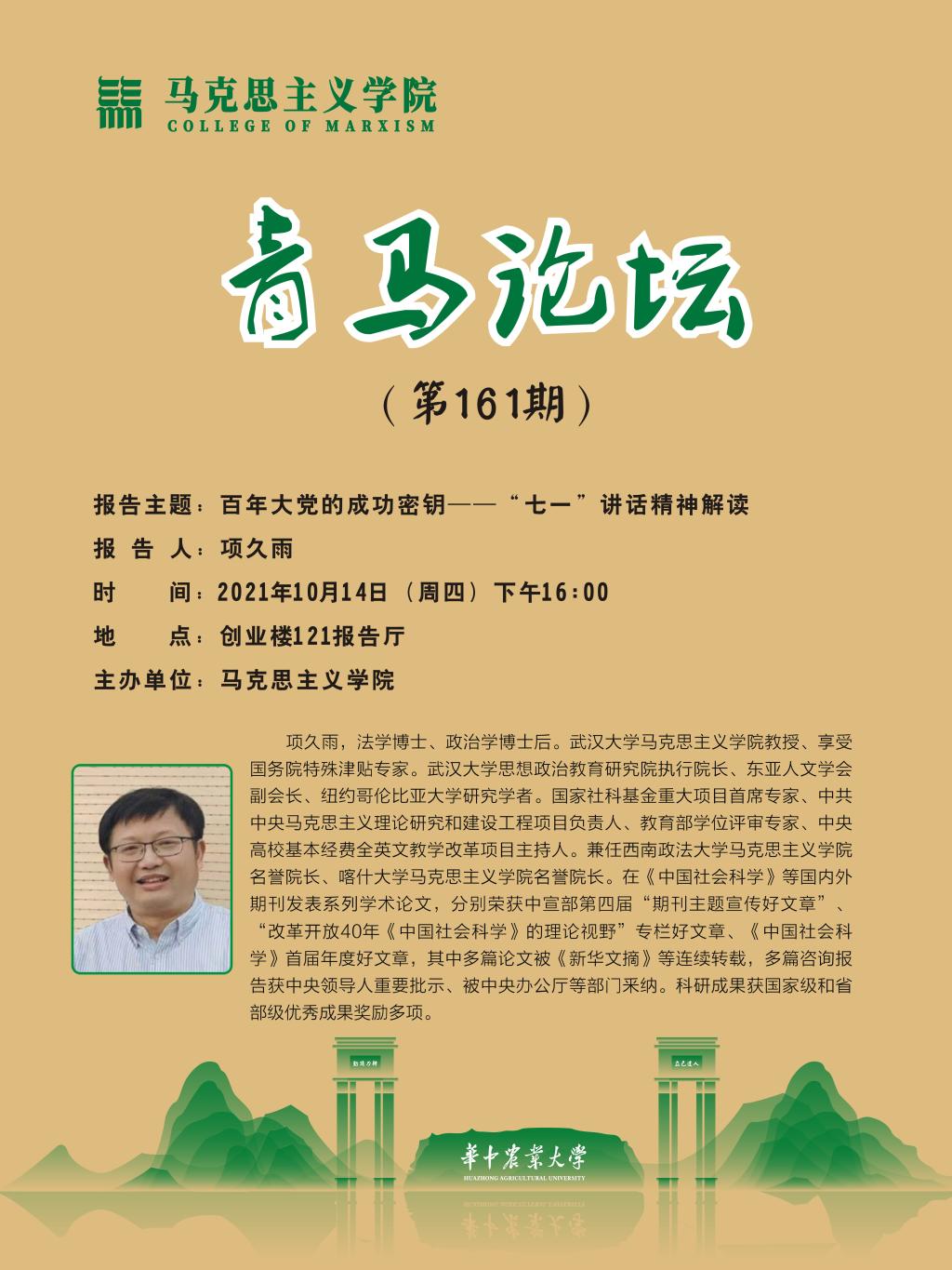 10月14日下午,第161期青马论坛于创业楼121报告厅举行。武汉大学365英国上市公司项久雨教授应邀作“百年大党的成功密钥——‘七一’讲话精神解读”学术报告。报告由院长梁伟军主持。