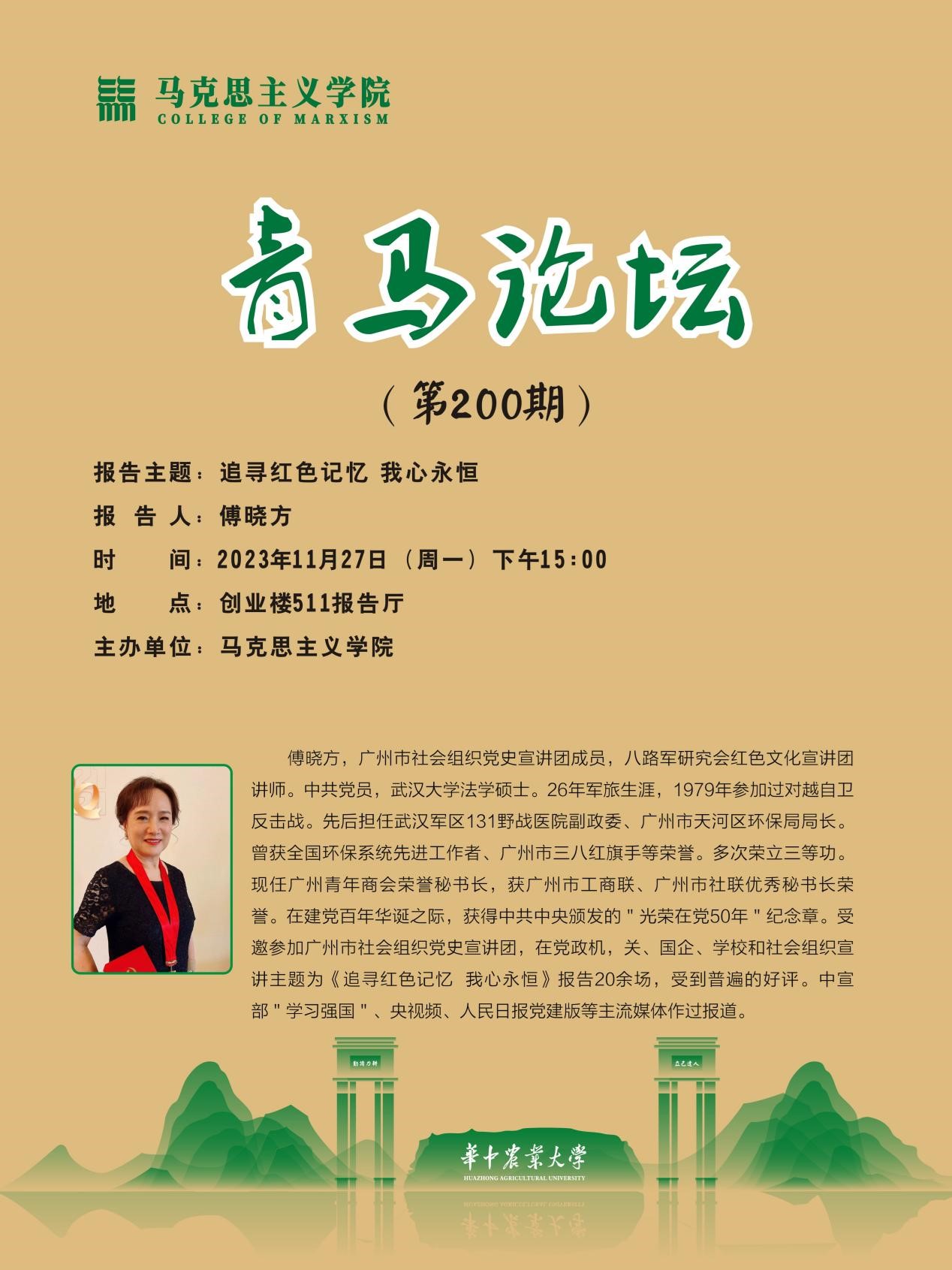 追寻红色记忆,激发奋进伟力。11月27日下午,365英国上市公司第200期青马论坛于创业楼511报告厅举行,广州市社会组织党史宣讲团成员、八路军研究会红色文化宣讲团讲师傅晓方老师应邀以“追寻红色记忆 我心永恒”为题作励志报告,与师生共同学习百年党史,分享父辈的革命奋斗史及个人成长史。报告会由学院党委书记程华东主持。
