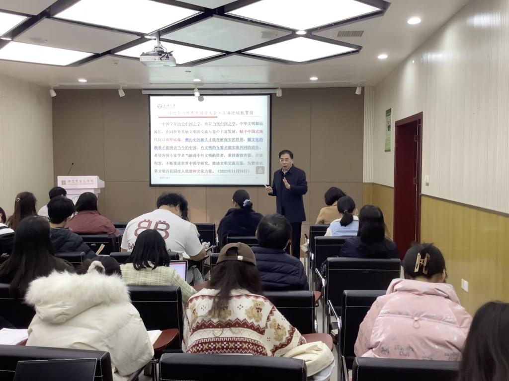 程华东对本次学术报告进行总结。他谈到,本次报告以“线”串“珠”,以文化为主线,阐发了中国式现代化、中华优秀传统文化、中华文明等相关理论,是一场讲学(学术)、讲课(示范课)、讲道(道理)、讲艺(艺术)的报告,希望学院师生进一步做好中国式现代化理论、习近平文化思想的内化、深化与转化,继续推进创新理论“三进三入”工作。