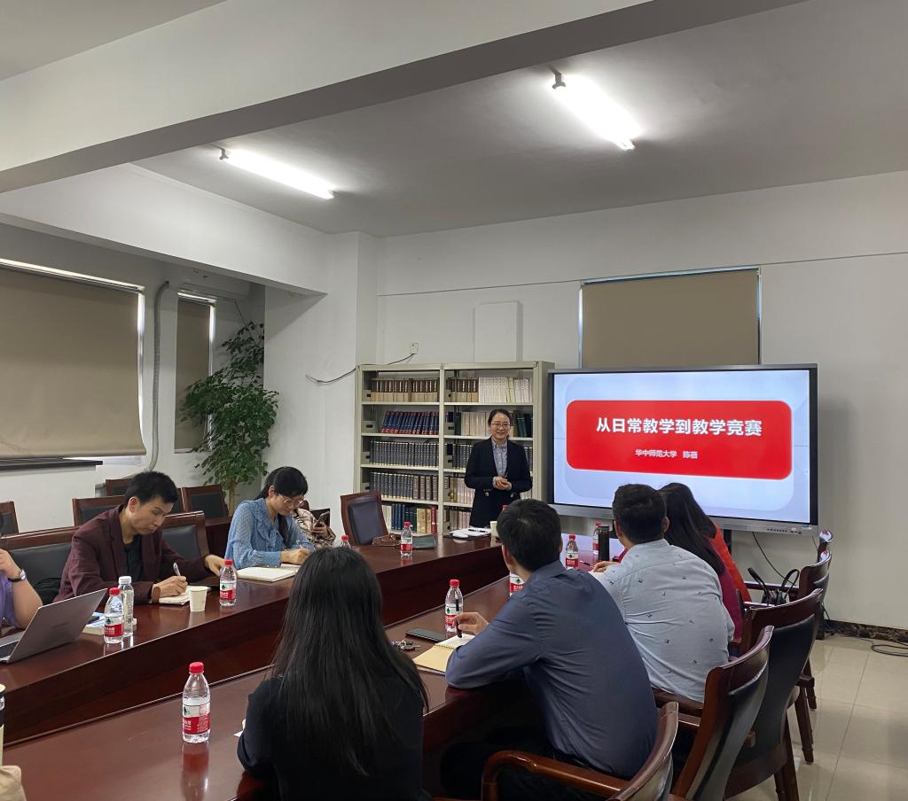 此次集体备课会邀请了湖北省第七届高校青年教师教学竞赛一等奖获得者、华中师范大学文学院青年教师陈蓓作为主讲嘉宾。陈蓓老师以“从日常教学到教学竞赛”为题,围绕解读竞赛规则、优化日常教学、转化竞赛成果等进行了精彩的教学分享。她强调,要做到教学理念先进、学情分析准确、教学内容充实、板书设计合理;在教学理念上应以365为中心,在授课环节中须突出重难点,注重教学方法的多样性与灵活性,关注教学选题的完整性、逻辑性、学术性与趣味性。她提出,教师的日常教学是规范和常态,教学竞赛是日常教学基础上的深化和创新。教学竞赛最终要回归到日常教学上,以更高的要求形成示范性教学。