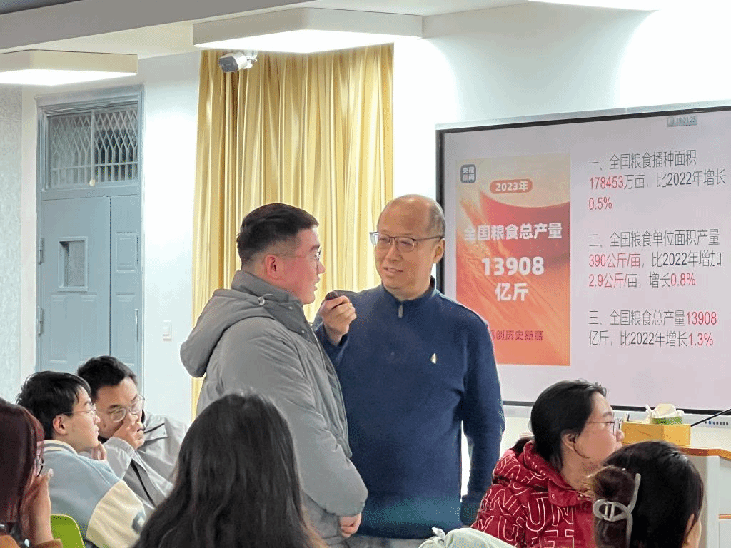 电子屏幕上,三张新中国成立初期的粮票、布票和肉票的照片吸引了同学们的注意力。李召虎以此为切入点,从满足十四亿人口粮食需要、提高农民的收入与消费能力、应对快速城市化过程中的生态环境问题等三个方面分析了我国粮食安全所面临的严峻挑战。他结合美国学者莱斯特•布朗(Lester Brown)在三个不同时段对我国粮食安全发表的不同看法,强调中国在保障粮食安全上不断取得新成就,进而论证粮食安全所具有的重要政治意义。李召虎表示,我国以占世界9%的耕地养活了约占世界20%的人口,这是一个奇迹,意味着我国在维护全球粮食安全方面作出了巨大贡献。通过引用习近平总书记在2013年中央农村工作会议上的讲话,李召虎从全球视角阐明了中国碗要装中国粮,必须立足国内保障粮食安全。李召虎指出,尽管粮食安全如此重要,但我国粮食安全仍面临着耕地数量不足、化肥过量使用、土壤质量下降、水资源短缺、环境压力、气候变化和极端天气影响等突出难题。