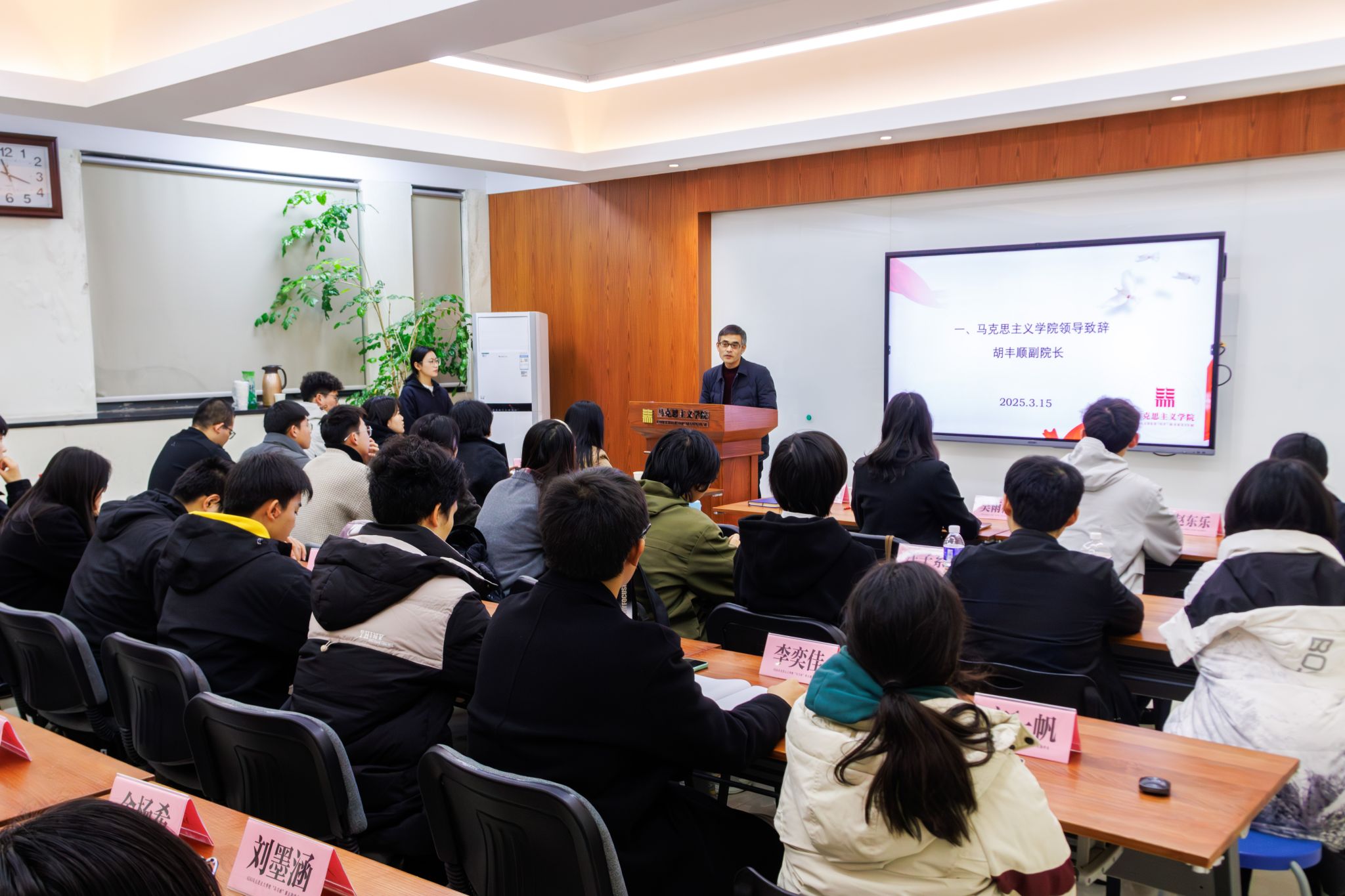 最后,班主任谢宁静老师对第五期新学员的到来表示欢迎,并寄语新学员同呼吸,共情谊;珍惜时间,积累精神财富。她谈到,大学毕业后,有很多时间和机会去赢取物质财富,但是积累精神财富的时间可能就在这四年内。理论学习是一种特有的训练,希望大家从一些看似枯燥艰涩的东西开始,逐渐去领会学术的境界,掌握求真的技能,培养对人类命运的关怀,与志同道合之友,共建自己的“精神家园”。