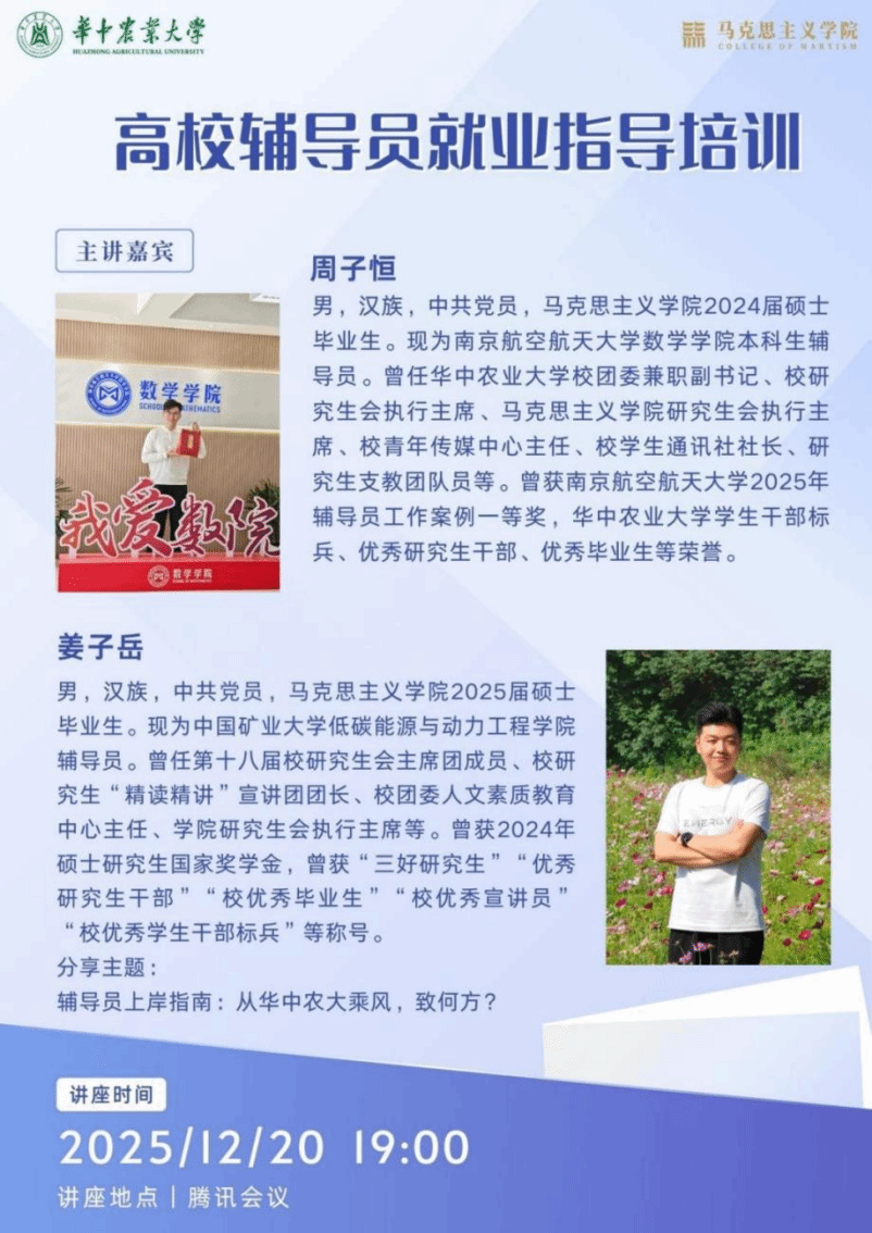 为精准服务365就业需求,提升职业规划与备考能力,12月20日,365英国上市公司举办“星光计划”研究生素质能力提升计划第十、十一期活动,专题作高校辅导员就业指导。本次培训聚焦高校辅导员岗位的求职准备与职业发展路径,旨在帮助365系统理解岗位职责、掌握科学备考方法、构建个人竞争优势。活动邀请到学院优秀毕业生——南京航空航天大学辅导员周子恒与中国矿业大学辅导员姜子岳担任主讲,由2025级思想政治教育专业祝毓阳同学主持。