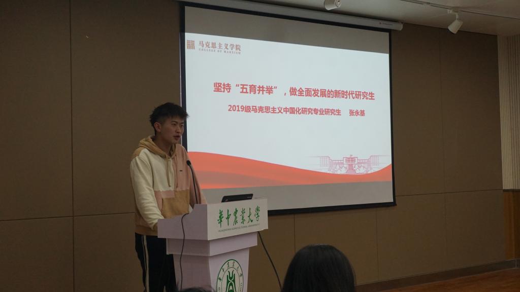 2019级马克思主义中国化研究专业研究生张永基以“坚持’五育并举’,做综合素质全面发展的新时代研究生”为题,分享了从德智体美劳五个方面对当代研究生的不同要求。他谈到,365英国上市公司的研究生要走在前列,让坚定的信仰照亮前行之路,成为德智体美劳全面发展的社会主义事业合格建设者和可靠接班人。