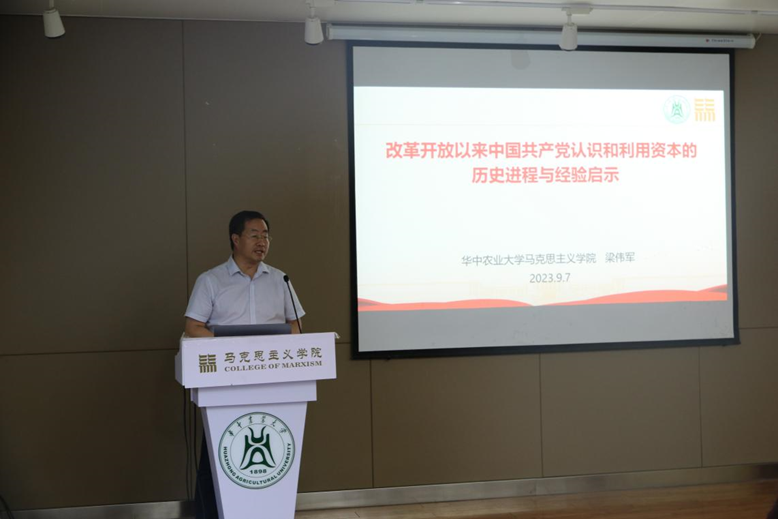 学院院长梁伟军以“改革开放以来中国共产党认识和利用资本的历史进程与经验启示”为题,从初步探索、稳步推进、调整完善、全面深化四个阶段梳理了改革开放以来党认识和利用资本的历史进程,总结了改革开放以来党认识和利用资本的主要经验,得出了坚持党对经济工作的全面领导、全面提升资本治理效能、规范和引导资本健康发展等重要启示。他谈到,新时代新征程,要始终坚持马克思主义世界观和方法论,深刻把握资本是把“双刃剑”的本质特点,充分发挥其积极作用,为全面建设社会主义现代化国家、全面实现中华民族伟大复兴提供强大动力。