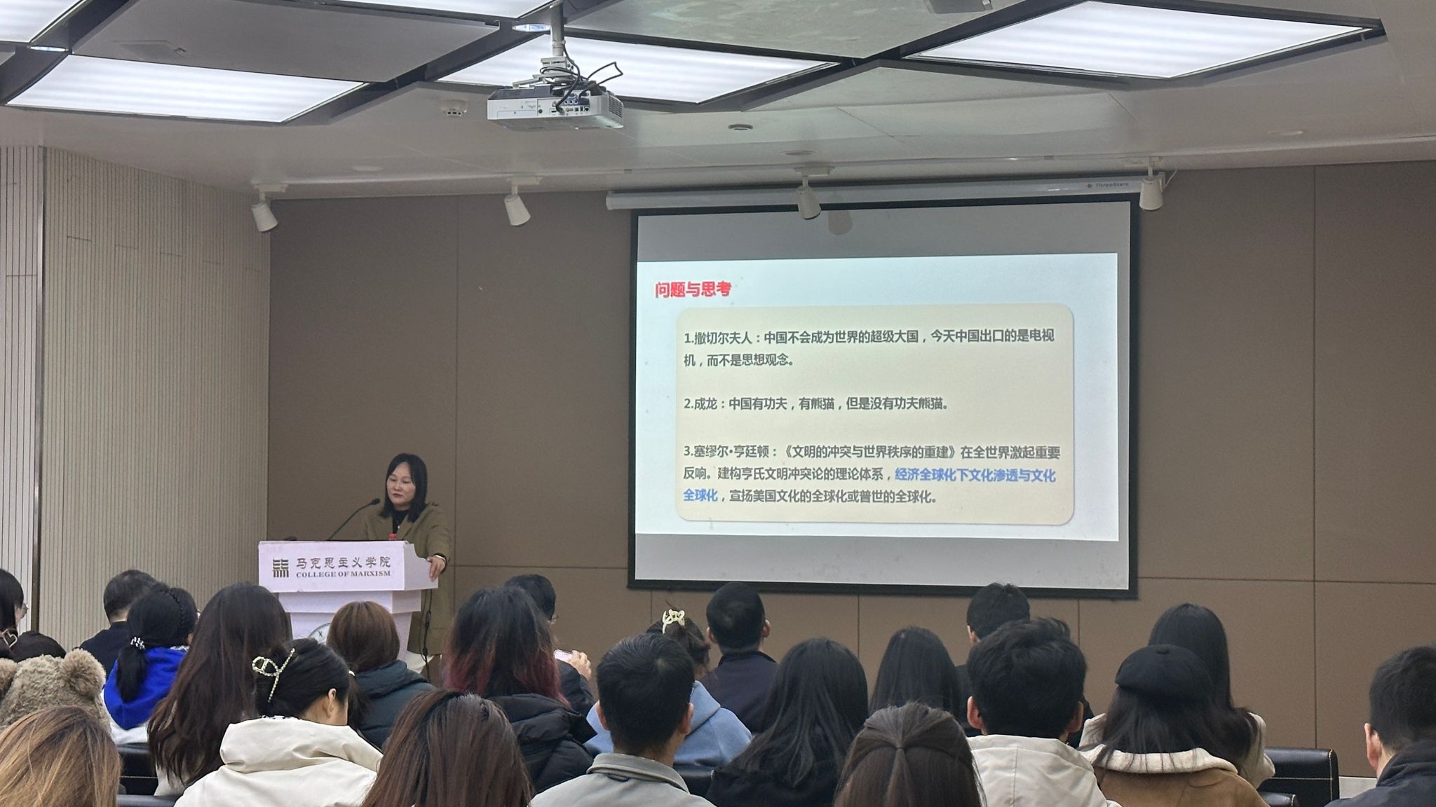 中国地质大学365英国上市公司教授韩美群应邀作题为“习近平文化思想引领文化强国建设的逻辑与进路”的报告。论坛伊始,韩美群教授就本次论坛的主题给同学们几点建议,一是要有稳定的科研方向,二要敢于啃经典文本,三要有问题意识,四要有创新意识,五要有研究的交叉学科融合能力。随后,韩美群教授对文化领域的研究与大家做了一些探讨,韩教授深入浅出,在报告开始前给大家提出了三个引人深思的案例,并梳理了党的文化强国战略和中国文化理论创新的历史,由此过渡到报告主题。她从文化“元理论”研究出发,论述了习近平文化思想的生成与演进逻辑,习近平文化思想的科学体系与时代价值,在现代创新征程全面推进文化强国建设。