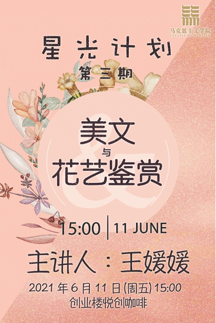 6月11日下午,马院“星光计划”第三期“花香·书香”主题活动在创业楼“悦创咖啡”成功举办,主要包括“不说再见,不负韶华”美文鉴赏、“簇锦团花”花艺鉴赏两个部分,学院教师及研究生参加了本次活动。活动邀请园艺林学学院王媛媛老师主讲,学院博阅读书会会长周萝希主持。