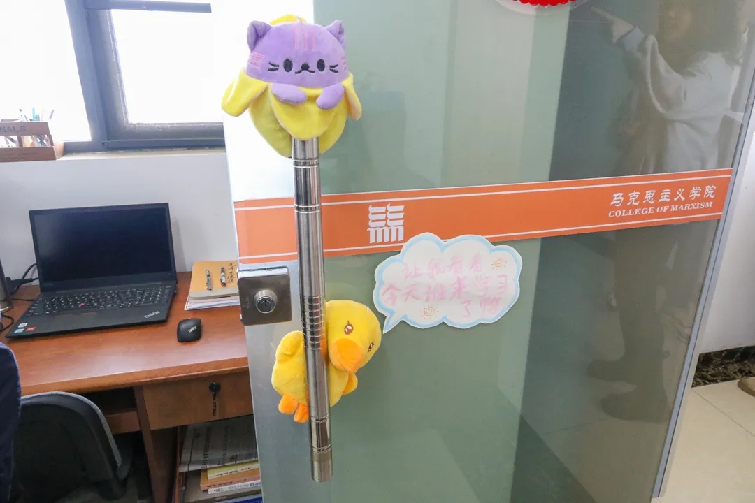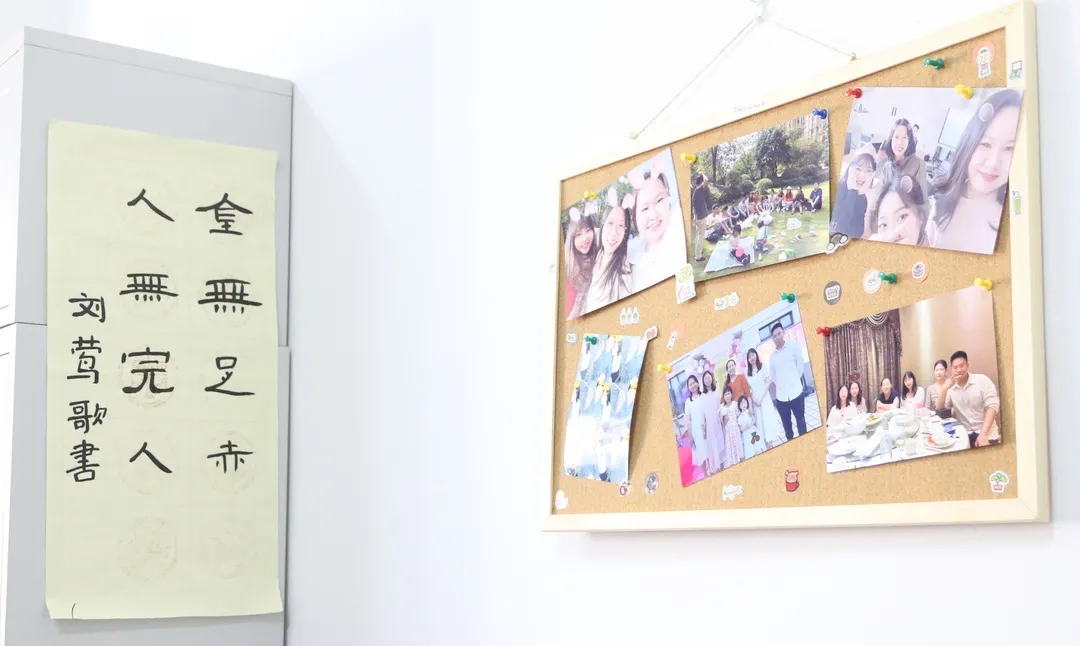 606研究室一直践行“成功来自99%的勤奋”,主体墙上呈现的多样书签和剪纸讲述着阅读积累的点滴故事。614研究室以“静心求学、格物致知”为理念,以自主创作的多幅中国画为装饰,表达对中国传统文化的热爱。
