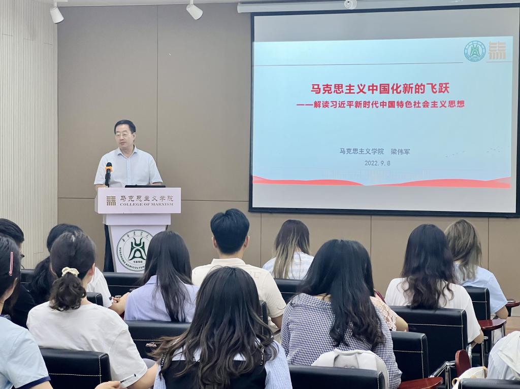 新生见面会后,学院院长梁伟军以“马克思主义中国化新的飞跃——解读习近平新时代中国特色社会主义思想”为题,从“讲清一个重大的理论命题是什么”和“何为理论创新中的‘飞跃’”两个问题出发,通过重点讲解中国特色社会主义进入新时代的历史方位、统筹推进国内国际“两个大局”的战略任务、中国特色社会主义三大新课题的鲜明主题、新时代中国特色社会主义思想的科学回答以及重大而深远的理论与实践意义的历史地位五个方面,引导新生深刻理解习近平新时代中国特色社会主义思想实现了马克思主义中国化新的飞跃。