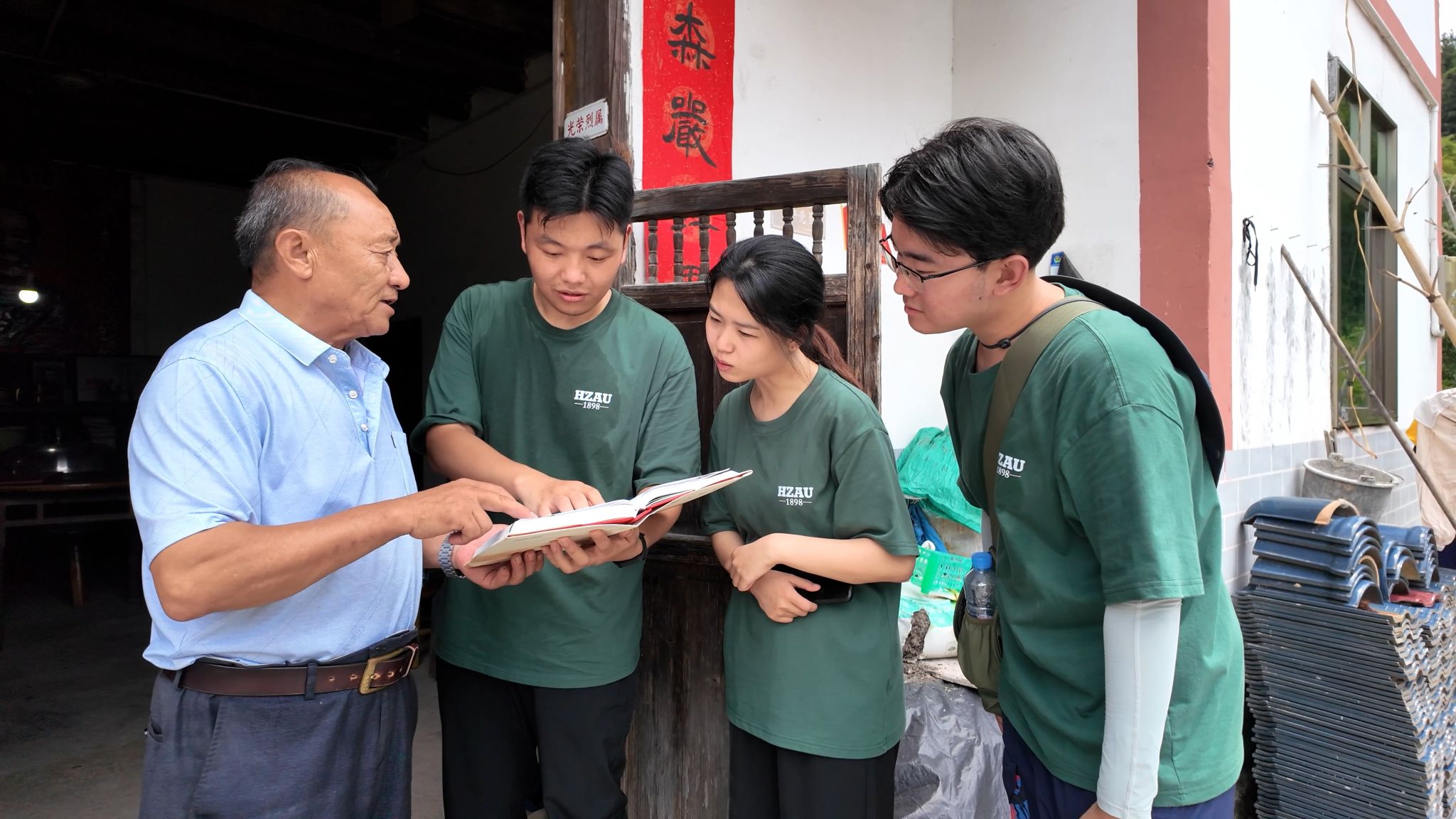 姜子岳与实践团队在大湾村调研
