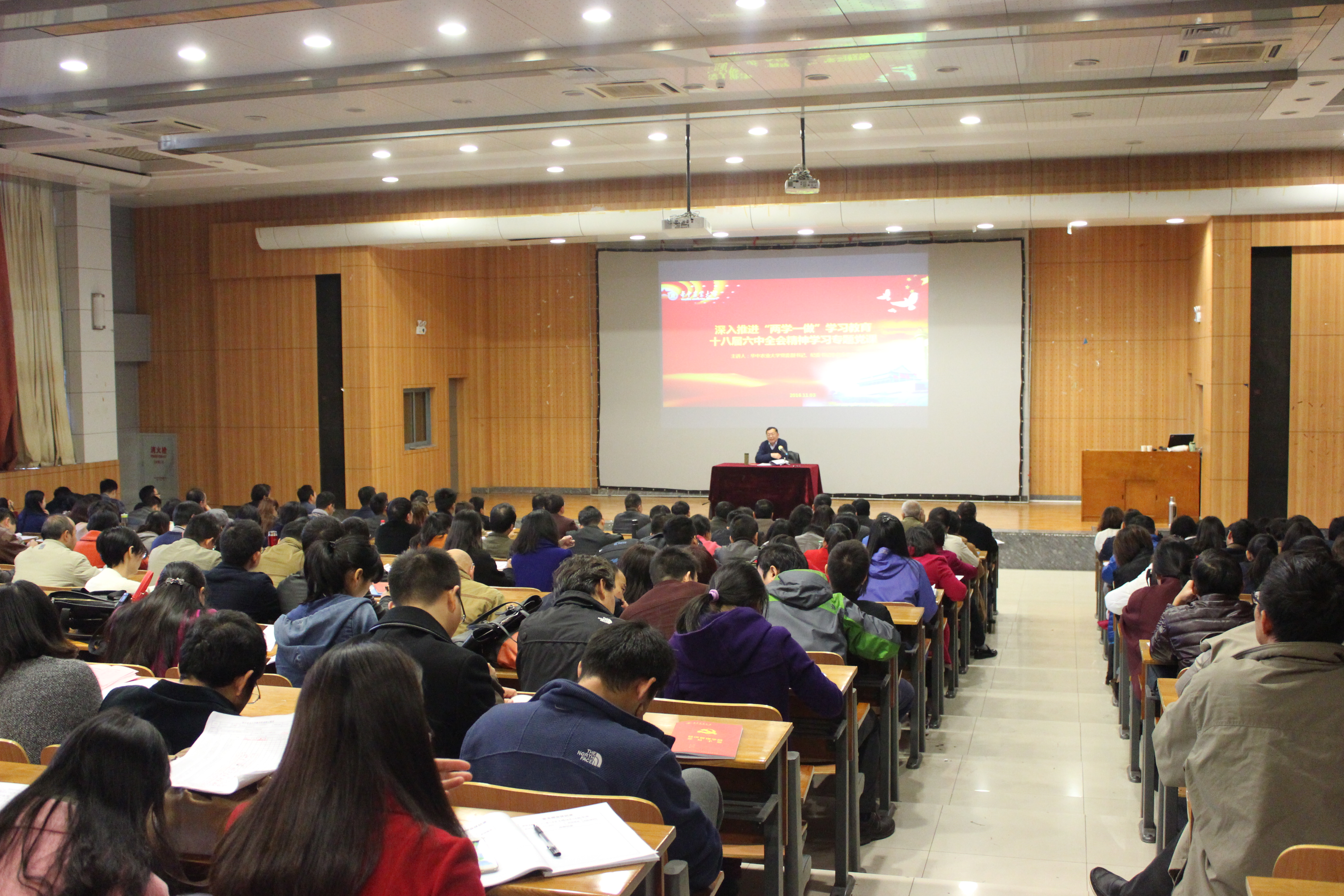 核心提示:11月3日下午,校党委副书记、纪委书记李名家教授以“深入开展‘两学一做’学习教育,学习领会十八届六中全会精神”为主题,在外国语学院报告厅为经管、文法、外语、马院、公管等五个学院的全体教职工党员讲授了一堂专题党课。
