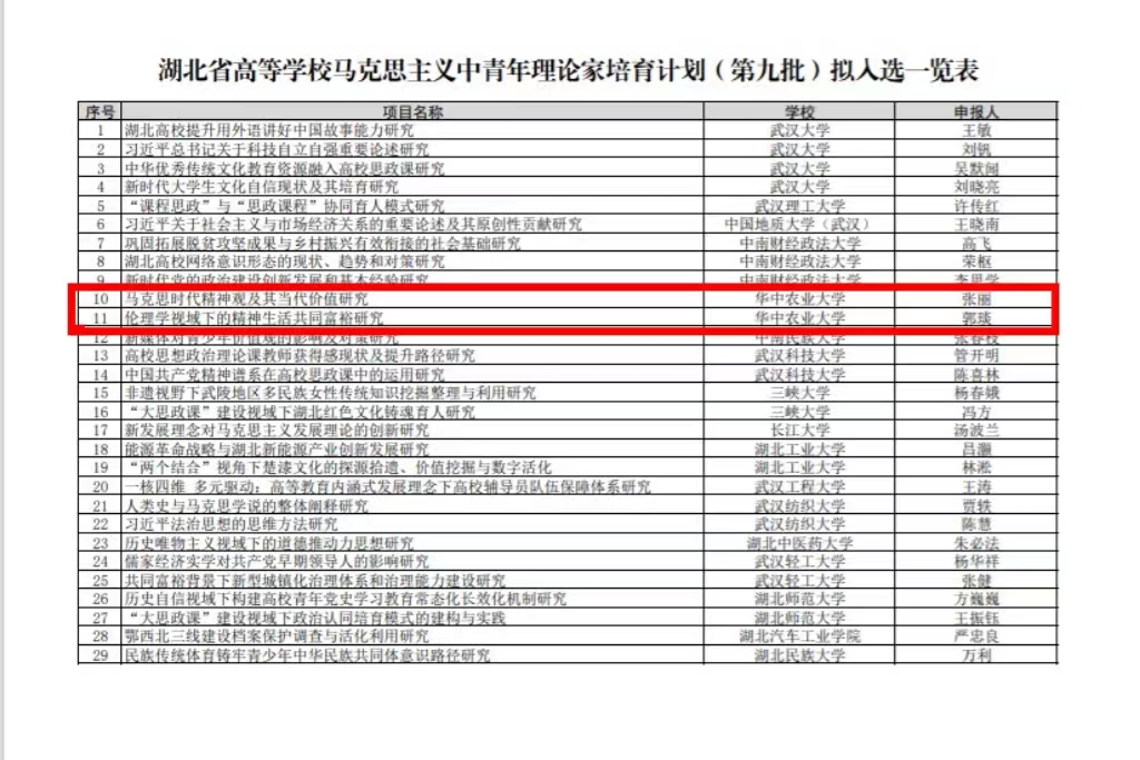 近日,湖北省教育厅公布了2022年度省社科基金前期资助项目评审结果,我院习近平新时代中国特色社会主义思想概论教研室张丽副教授、马克思主义基本原理系郭琰副教授入选湖北省高等学校马克思主义中青年理论家培育计划(第九批)。