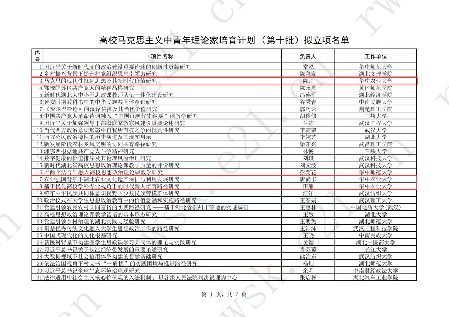 近日,湖北省教育厅公布了2023年度省社科基金前期资助项目(高等学校马克思主义中青年理论家培育计划(第十批))评审结果,我院习近平新时代中国特色社会主义思想概论教研室陈帅副教授、思想政治教育系田甜副教授、中国近现代史系唐尚书博士入选湖北省高等学校马克思主义中青年理论家培育计划(第十批)。