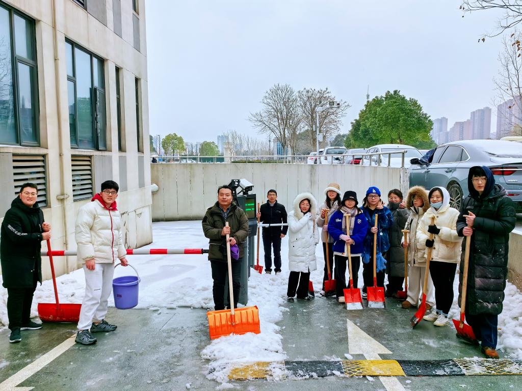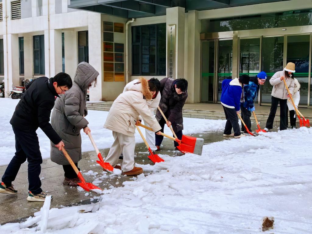 下午,马院师生集中力量铲除创业楼周边、地下车库出入口的冰雪,为师生平安出行保驾护航。
