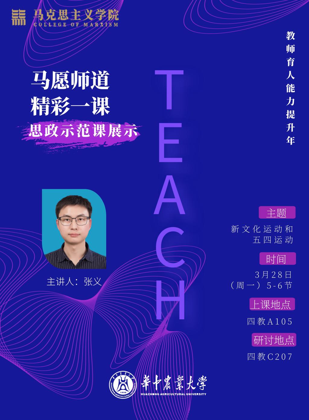 四教A105教室,张义老师在林学2102班课堂上以“新文化运动”为主题,通过具体的历史人物与事件将新文化运动的背景、过程及深刻意义等方面串联起来,向大家展示了一堂生动的思政课。教学过程精彩有趣,课堂氛围活跃热烈,学习效果收获满满,师生纷纷表示赞扬。