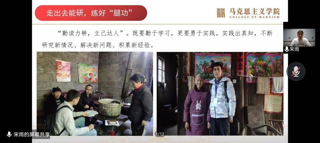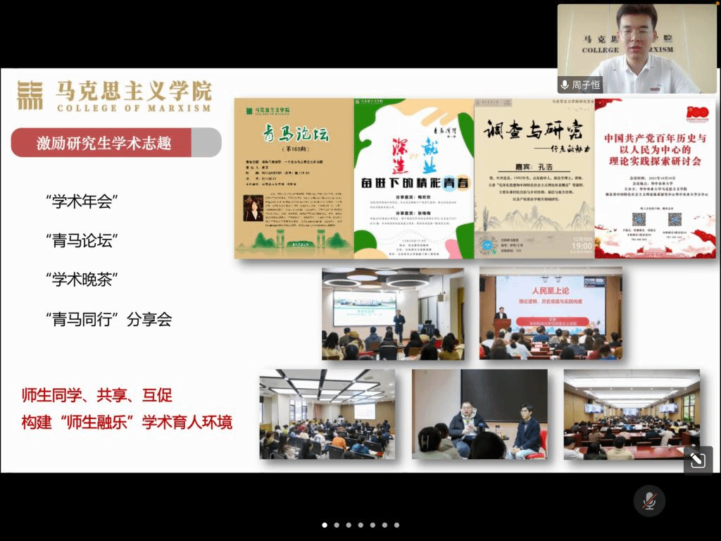 9日下午,硕士生导师彭文刚副教授和研究生代表宋雨分别向夏令营学员作学术汇报和交流分享。彭文刚老师以“理解资本主义的三种理论——马克思、涂尔干、韦伯的资本主义理论”为主题,从马克思的异化理论和人的全面发展、涂尔干的失范与道德个人主义以及韦伯的合理化与价值理性的迷失等不同角度,系统分析了他们对资本主义的不同理解。2020级研究生宋雨从美丽的华农校园、温馨的马院家庭、丰富的班级活动以及个人的全面发展等四个角度,生动地介绍了学校特色、学院特点,他强调大家要努力做到静下来能学、坐下来能写、站起来能讲、走出去能研,鼓励大家锻炼听说读写、学思践悟方面的能力。