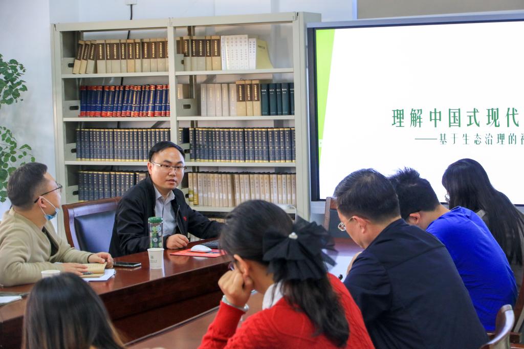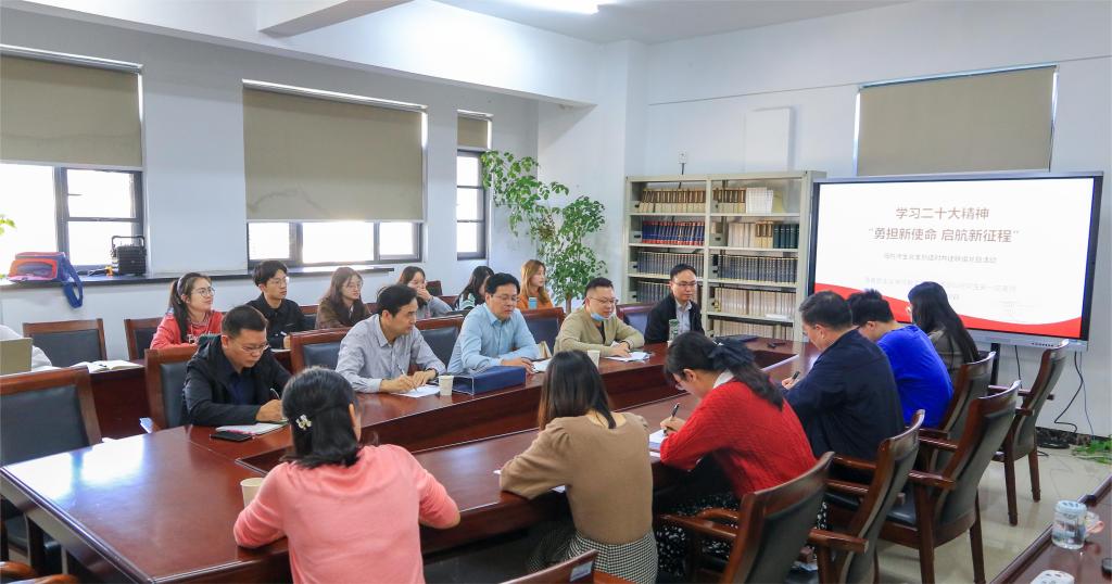 与会成员围绕学习贯彻党的二十大精神,深入开展学习交流。教工党员石绍成基于生态治理的视角带领大家深入理解中国式现代化的深刻内涵,并指出中国式现代化具有“党的领导、责任导向、法律规制、协同治理、知识保障、因地制宜”六个鲜明特征。研究生党员杨小斐聚焦文化建设,分别阐述了中国式现代化引领下的文化建设的内涵与要求、繁荣发展文化事业与文化产业的实践路径以及新时代青年的思考与启示,她谈到作为新时代青年应从价值本体出发,深入发掘中华优秀传统文化的价值,以全面灵活的现代传播方式为依托,不断提高传播力、创新力和讲故事的能力。研究生党员易雯雪梳理了党的二十大报告中全面建设社会主义现代化国家的相关论述,结合马克思主义现代化国家理论做了进一步阐释,分享了党的二十大精神学习要“悟出逻辑、抓住重点、明确身份”的深刻感悟。