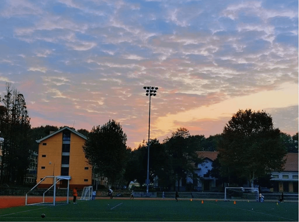 夕阳下的西运动场:虽然太阳每天都会落下,但不影响操场上意气风发的青年。展现了青年不为环境所动,依然保持朝气。