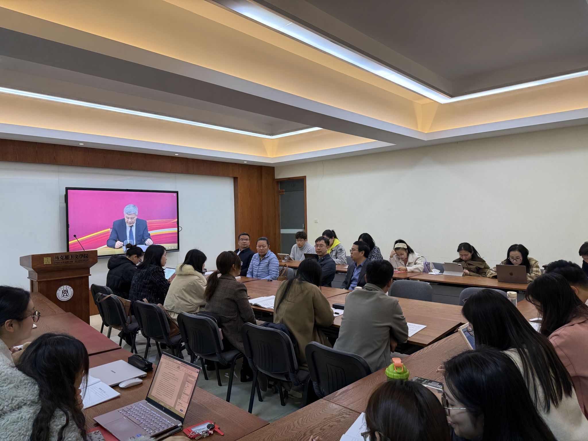 会议伊始,师生共同观看了“学习贯彻党的二十届三中全会精神培训课程”的视频。视频中,专家解读了全会精神实质,详细阐述了会议的背景与核心要义,并深刻分析了当前形势下改革的必要性与紧迫性,专家介绍了全面深化改革的原则与目标,为党员同志们学习贯彻党的二十届三中全会精神提供了深入且全面的指引。