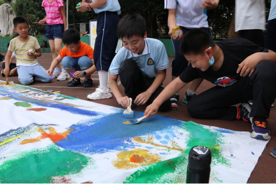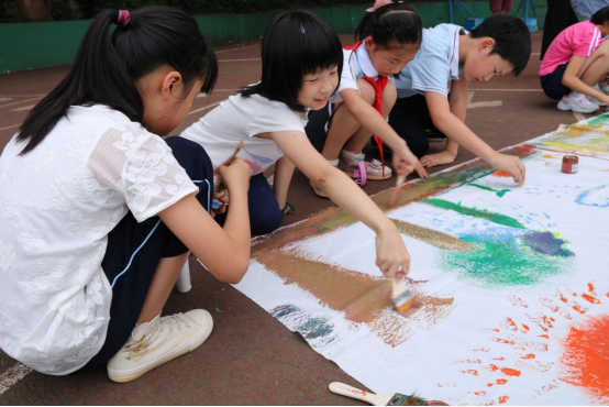 在自由涂鸦环节,参与活动的小365们各自分组,充分发挥想象力和创造力,在一块5米长的空白画布上绘制出一幅幅充满童趣的画作,涌现出一个又一个小“梵高”、小“莫奈”。 孩子们沉浸在自由涂鸦的乐趣中,手上、衣服上都沾上了颜料,但脸上却洋溢着幸福、满足的笑容。