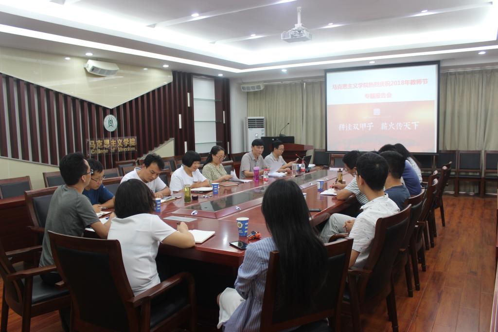 值此教师节之际,2018年9月10日下午,马院在人文楼M327会议室召开了庆祝第34个教师节暨师德师风教育专题会议。大会上,党委教师工作部部长程华东为全院教师作了题为“立德树人 始于师德——浅谈师德修养 ”的专题报告,报告会由学院党委书记王洪波主持。