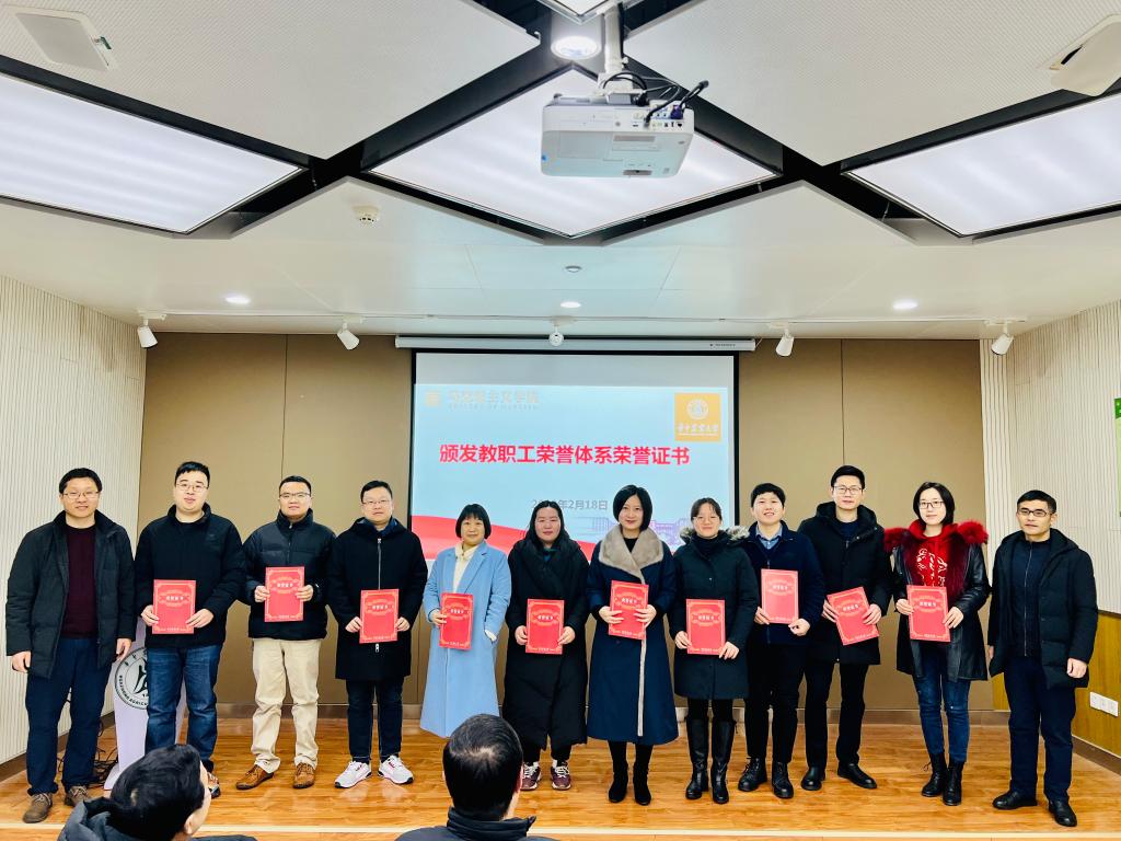 会议伊始,学院为新进青年教师指导教师颁发聘书,为2021年度教职工荣誉体系获评各类荣誉奖的教师颁发荣誉证书,并勉励全体教职工以此为榜样,合力推进学院事业高质量发展。
